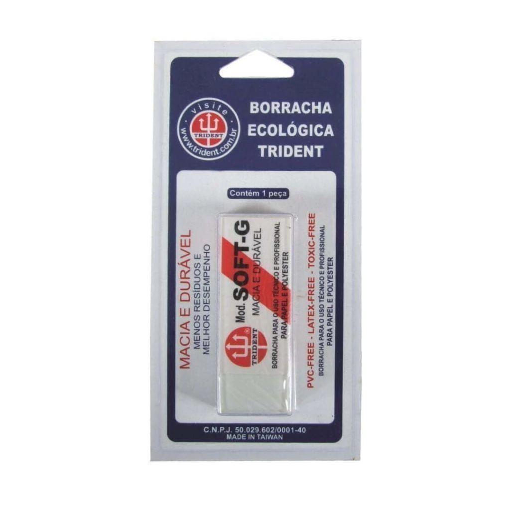 As BORRACHAS TRIDENT são fabricadas em SOFT HI-POLYMER, um revolucionário polimento de alta densidade, muito macio e menos abrasivo que os usados nas borrachas convencionais, o que faz com que APAGUEM MAIS com MENOS PRESSÃO. Os elastômeros, que compõe a sua fórmula, tendem a se manter unidos quando se soltam do corpo da borracha, pelo atrito, no ato de apagar e formam um número menor de partículas. Ou seja, produzem resíduos agregados, maiores, e em número menor que as borrachas normais, tornando mais fácil a limpeza dos trabalhos. Fabricadas dentro das normas internacionais, EN71, BS566 e ASTM D4236 STANDARD, que regulamentam o uso de produtos tóxicos. PVC-FREE LATEX-FREE TOXIC-FREE. Embalagem em blister com 1 borracha G. Dim. 62 x 21 x 11,5 mm
