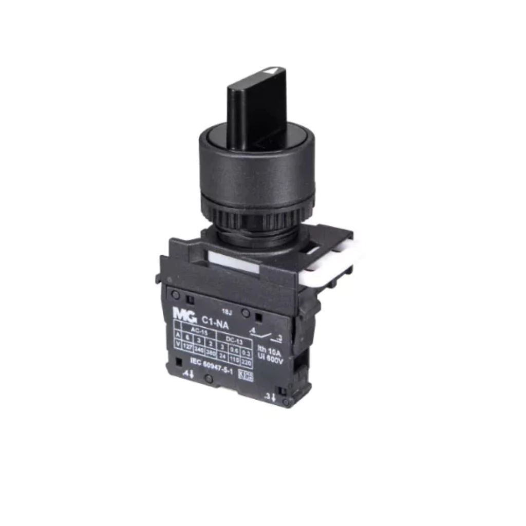 Botão comutador 2 posições - 1NA Os comutadores rotativos podem ser do tipo com ou sem retenção, podendo contar ainda com a possibilidade de combinar ambos em um só produto. Em geral são destinados a ligar, desligar ou comutar (transferir) um circuito elétrico ou parte dele, a fim de realizar uma segunda função ou ligar outro dispositivo. Temos comutadores com duas ou três posições, com diversos complementos.