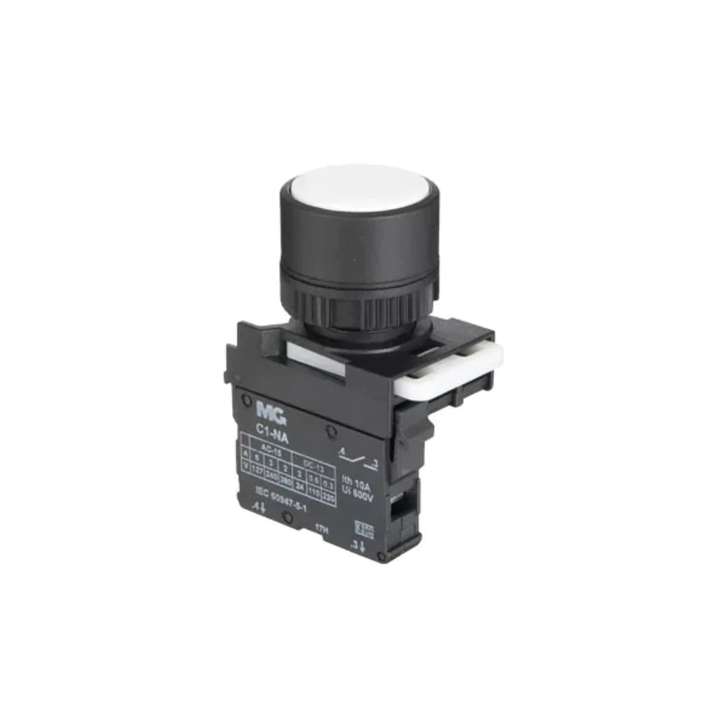 O botão faceado simples, também conhecido como botão pulsador ou botão sem retenção, é geralmente usado no em circuitos de comandos com contatores.