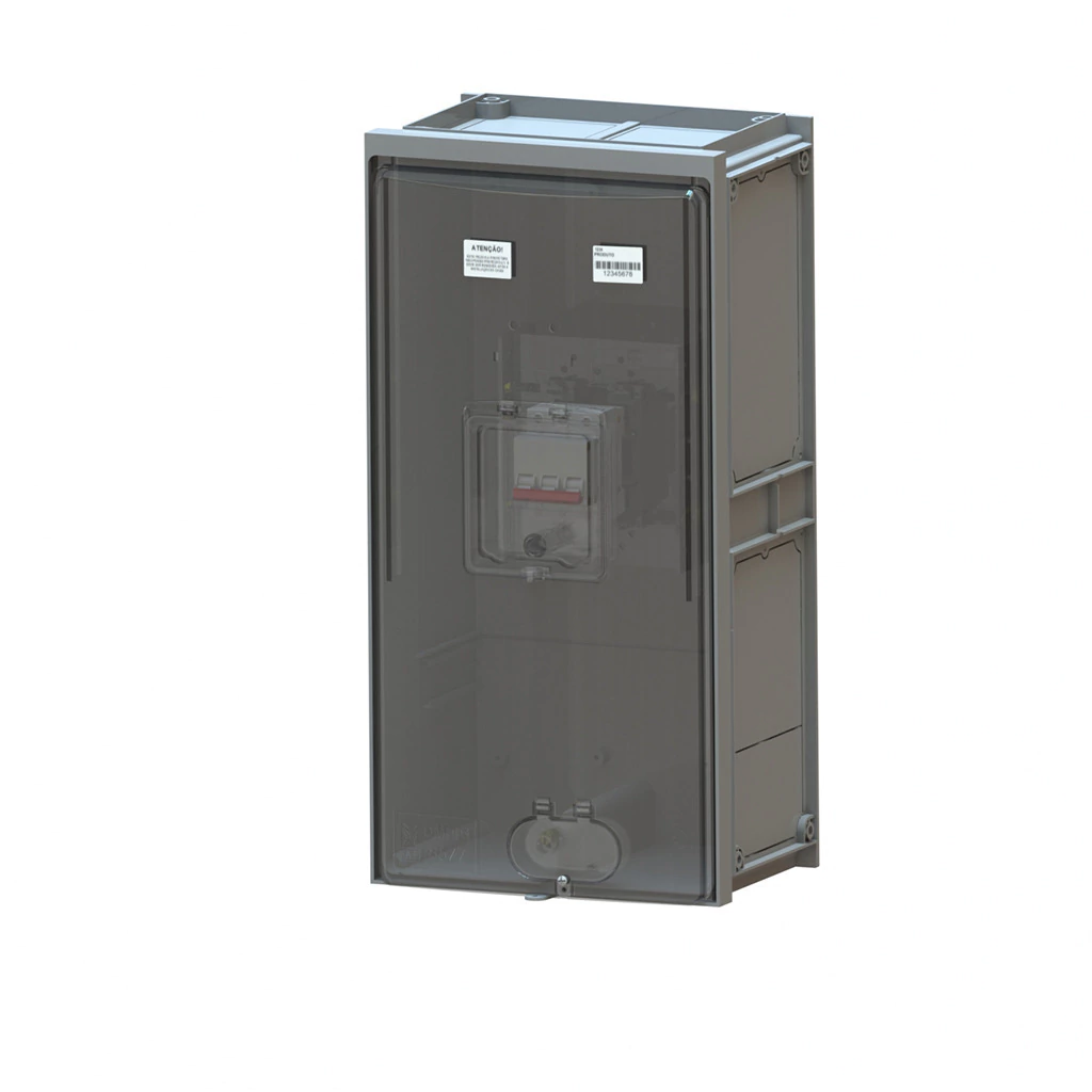 Caixa de agrupamento para proteção de disjuntor GERAL ou disjuntor em CAIXA MOLDADA. Instalada tanto em muro lateral como frontal, em conjunto com caixas de medição, de barramento ou DPS.