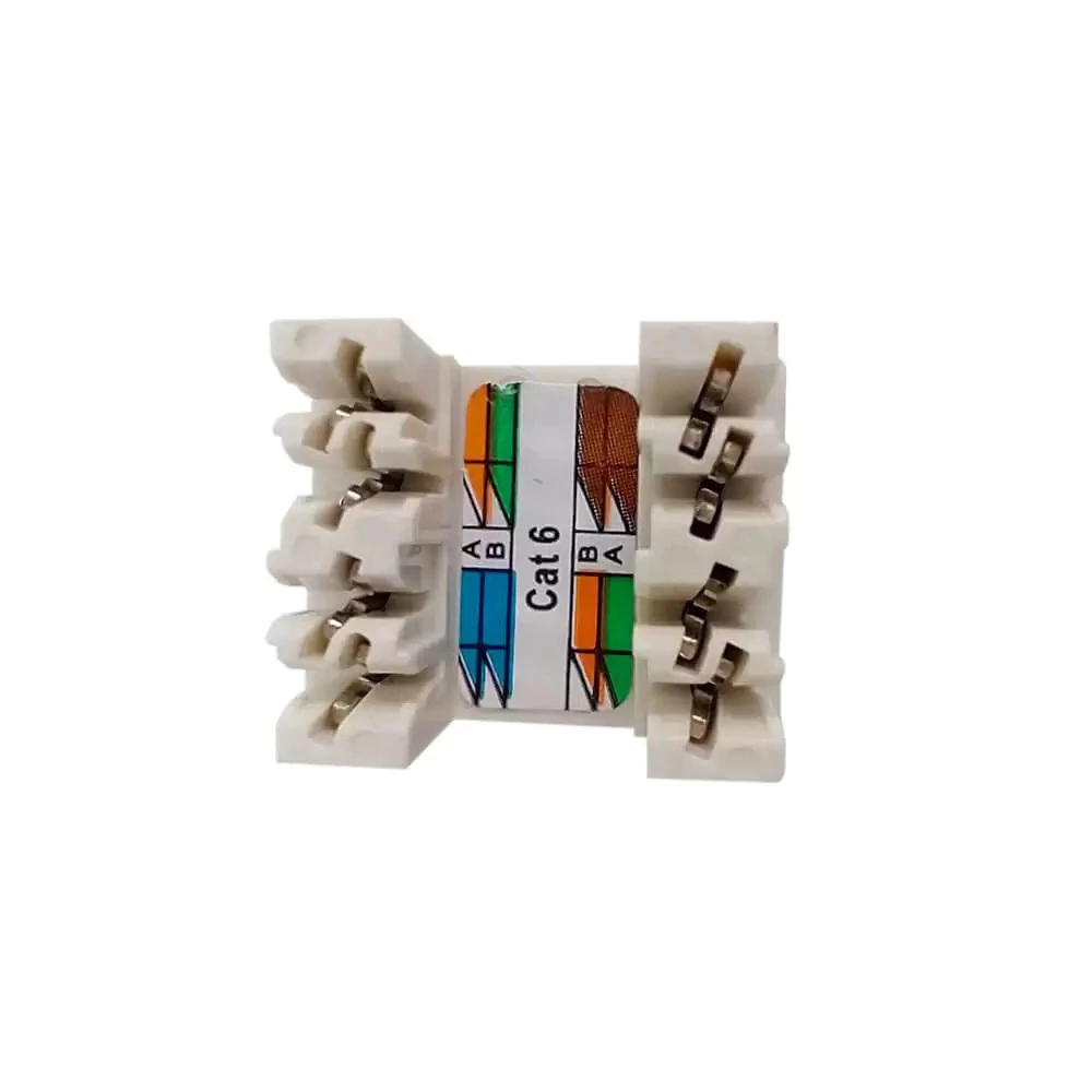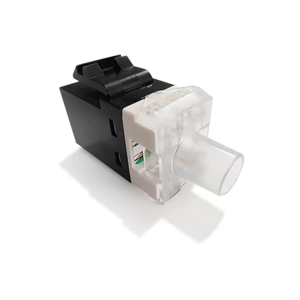 Conector Jack / Keystone / Tomada Fêmea, **Cat.6** , em 180º, RJ45 ( 08×08 ), tampa traseira no padrão Cristal Contato traseiro no padrão IDC-110 Permite montagem no padrão 568A ou 568B Material dentro da Diretiva RoHS Embalado individualmente em sacola plástica com furo para pendurar Recomendado para uso interno em ambiente não agressivo NCM. 8536.90.40