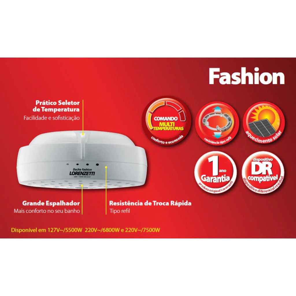 Destinada a oferecer conforto e economia na hora do banho, a ducha Fashion possui 4 opções de temperaturas, sendo ideal para todas as estações do ano, um espalhador de grandes dimensões, que proporciona maior vazão de água e um prático e deslizante seletor de temperaturas.