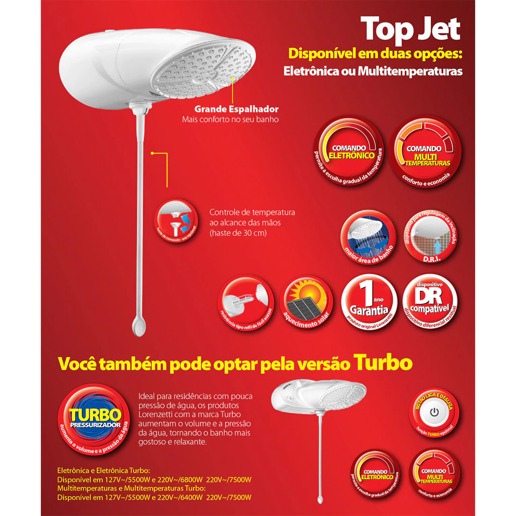 DUCHA TOP JET TURBO MULTITEMPERATURAS 220 VOLTS 7500 WATTS COD 7541515 - LORENZETTI