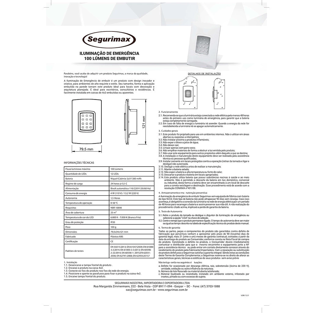 Iluminacao emergencia LED 100 lumens embutir - autonoma COD 25684 - SEGURIMAX