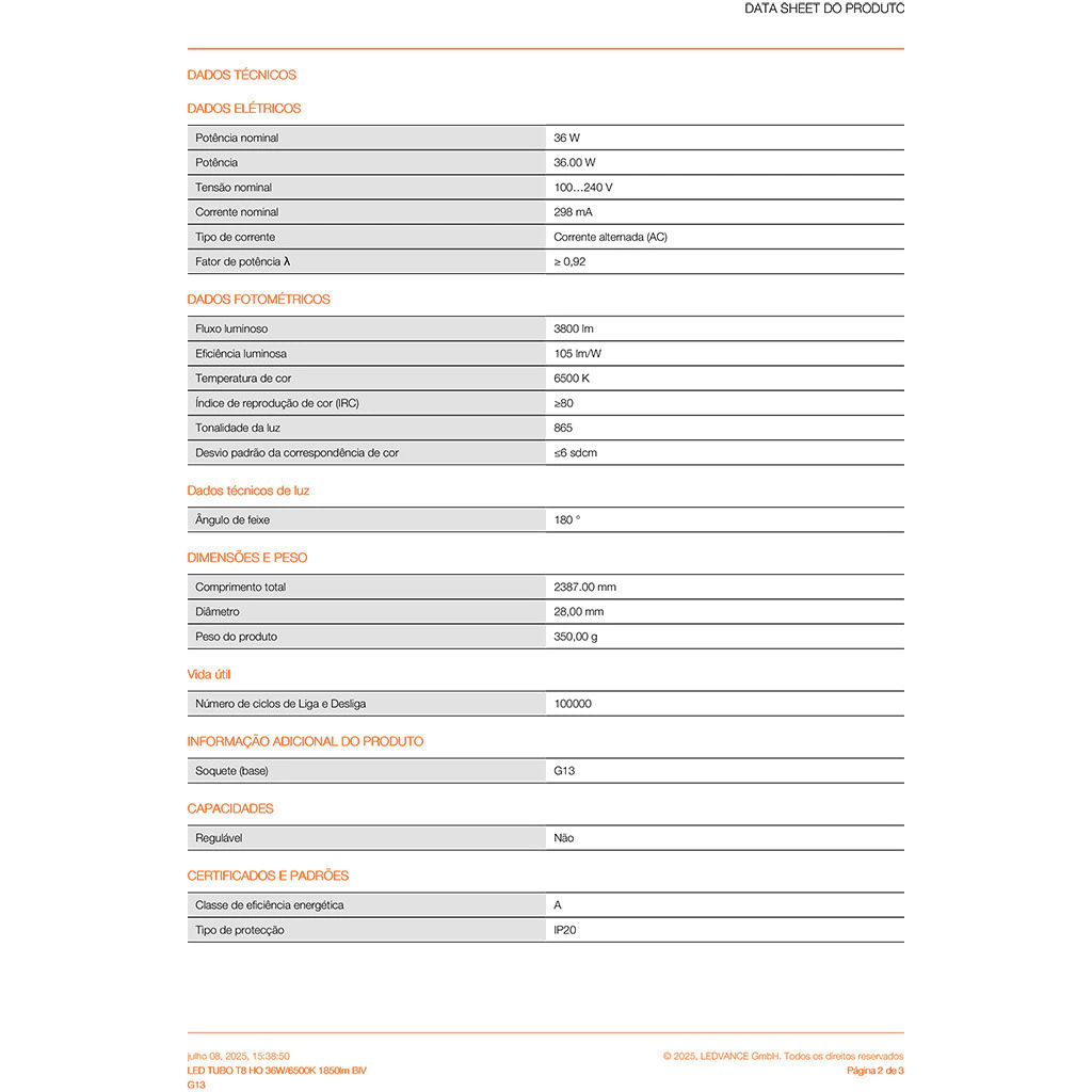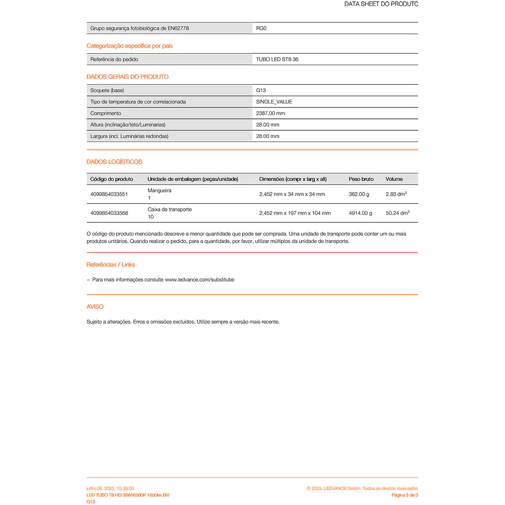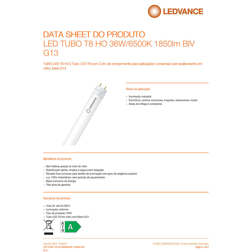 Lampada HO LED TUBO T8 36W 6500K 3800lm BIV G13 COD 7019714 - LEDVANCE
