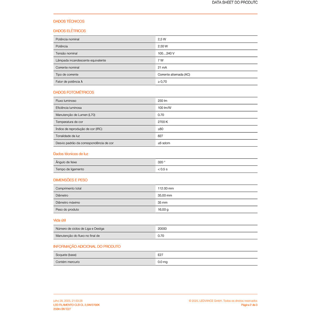 Lampada LED Filamento VELA CL 2.5W 2700K 250lm BIVOLT E27 G4 COD 7019180 - LEDVANCE