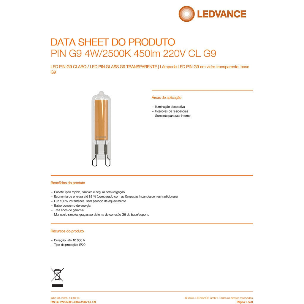 Lampada LED PIN G9 CL 4W 2500K 450lm 220V COD 7020219 - LEDVANCE