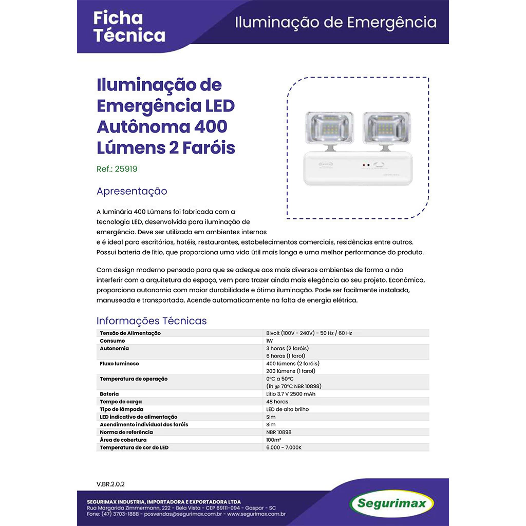 Luz de Emergência LED Autônoma 400 Lúmens 2 Faróis COD 25919 - SEGURIMAX