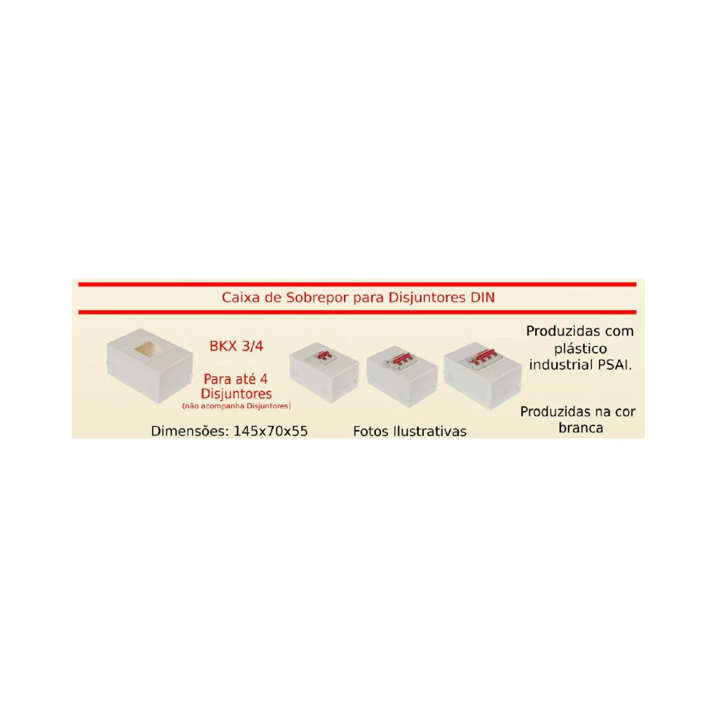 QUADRO BKX 3/4 SOBREPOR BRANCO CODIGO 0304041 - BIKIDescrição:Caixa de Sobrepor para Disjuntores DINProduzida com plástico PSAI.Produzido na cor BrancaDimensão: 145X70X55FABRICANTE BIKICódigo EAN (GTIN) 7897223000756