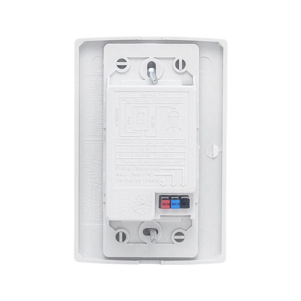 Sensor de embutir; com engate rápido para 3 fios, funciona com qualquer tipo de lâmpada; a fotocélula serve para diferenciar dia/noite, ou seja, quando o sensor detectar um movimento e detectar que há claridade no local, ele entende que a lâmpada não precisa acender, economizando energia.