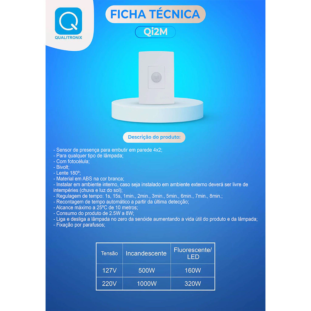 SENSOR DE PRESENÇA MICROCONTROLADO 180º COM FOTOCÉLULA E 6 FUNÇÕES BRANCO COD QI2MB - QUALITRONIX