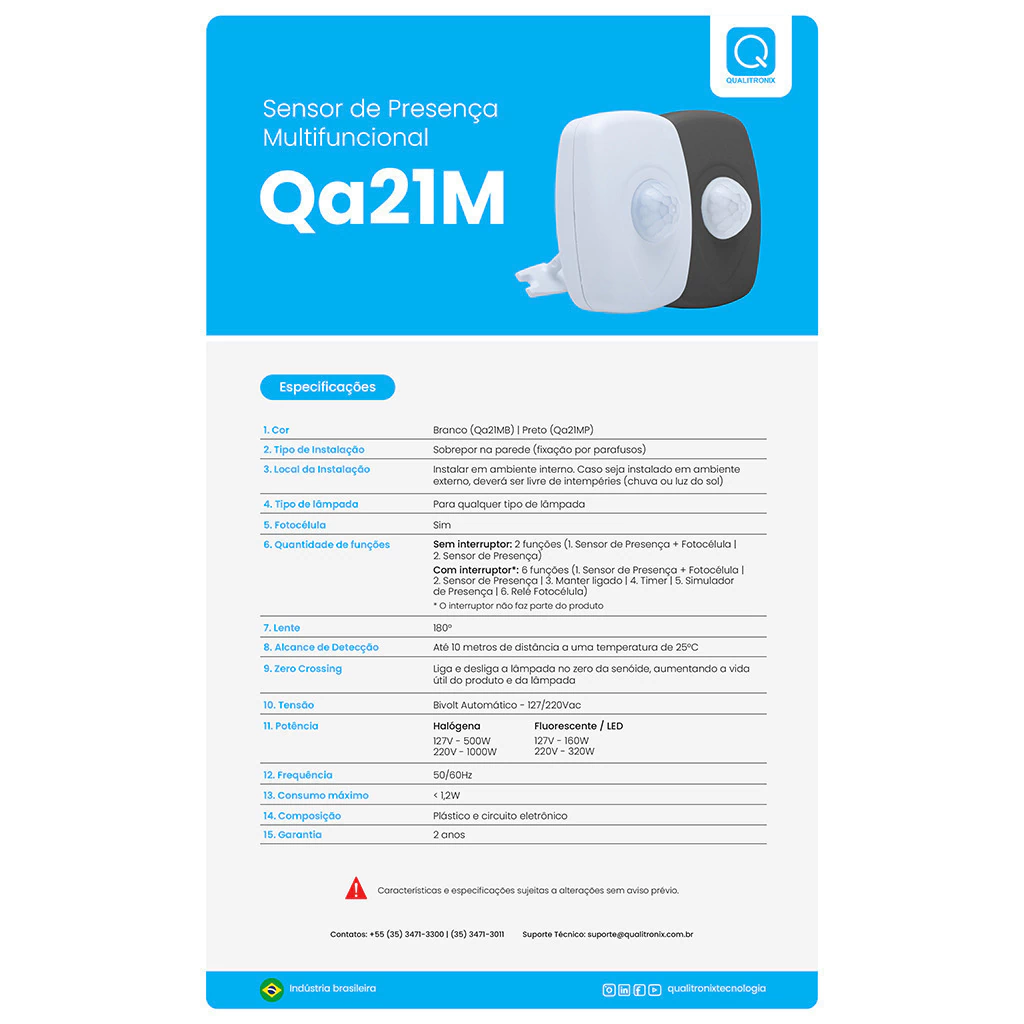 SENSOR DE PRESENÇA MICROCONTROLADO 180º COM FOTOCÉLULA E 6 FUNÇÕES PRETO COD QA21MP - QUALITRONIX