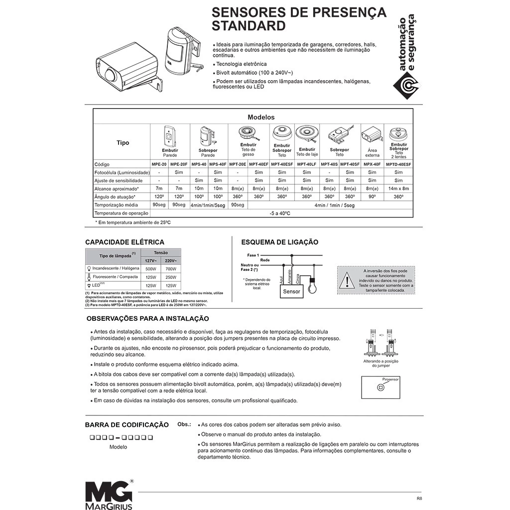 SENSOR DE PRESENÇA INTERNO TETO DE EMBUTIR E SOBREPOR BRANCO MPT-40ESF COD 17283 - MARGIRIUS