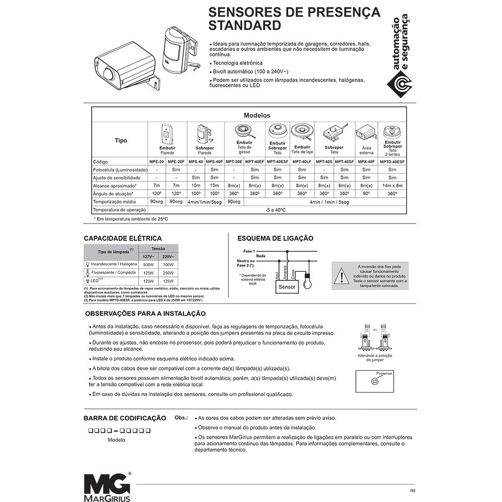 SENSOR DE PRESENÇA STANDARD PAREDE SOBREPOR PRETO COM FOTOCELULA MPS-40F COD 16607 - MARGIRIUS