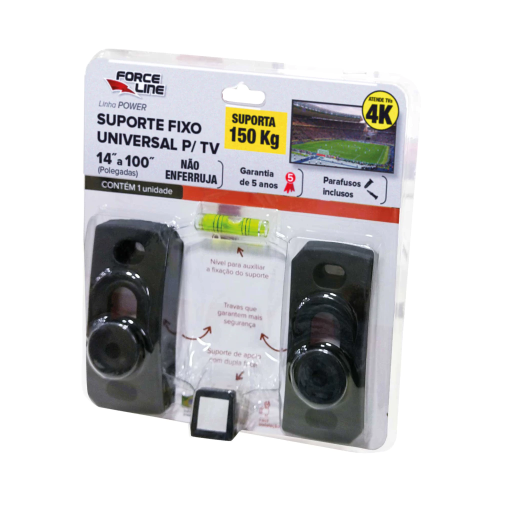 Características Técnicas Tipo Suporte Fixo Universal para TV Polegadas 14" à 100" Categoria Parede Modalidade Fixo Fixação Universal Distância da Parede 2,6 cm Cor Preto Capacidade Suporta até 150 Kg Material Plástico Nylon (alta resistência) Inclinação - Furação Compatível VESA: Ajustável à todas furações VESA Kit Parafusos (Fixação na Parede) 4 parafusos 1/4"x45mm / 4 buchas S8 Kit Parafusos (Fixação na TV) M6x25mm / M8x25mm / M8x45mm Nível Bolha Sim